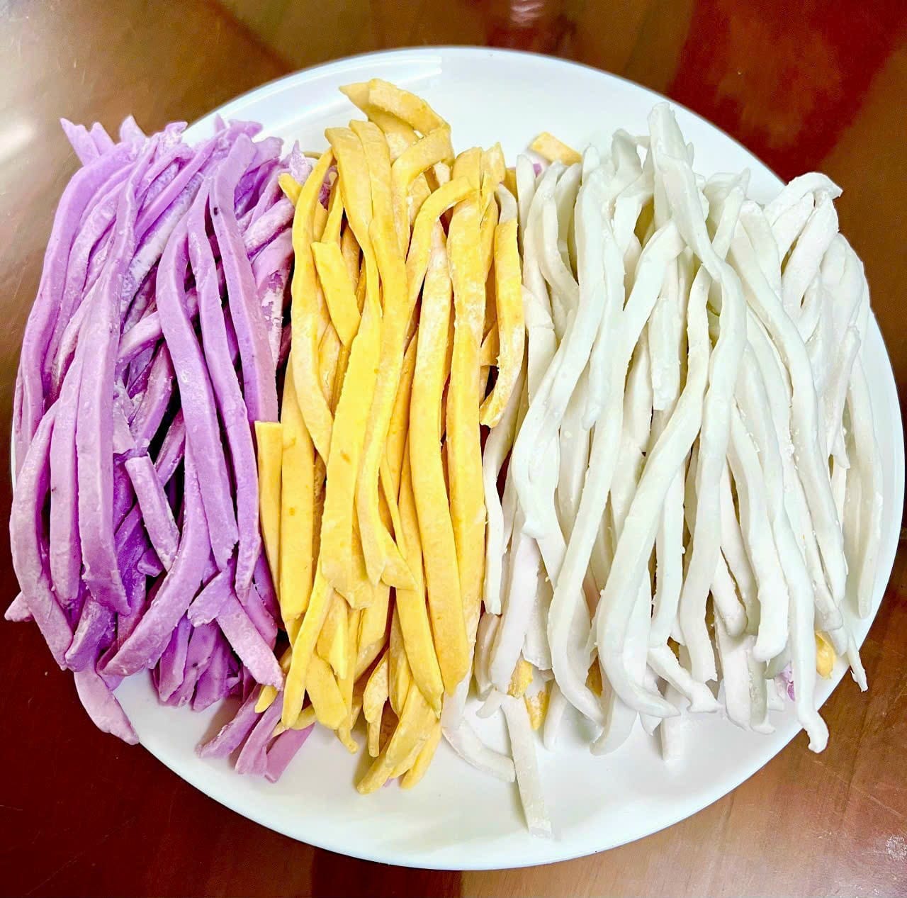 Bánh canh bột xắc 3 màu chuẩn vị Vĩnh Long được làm từ bột gạo, bột ấu hoà quyện với màu tím của khoai lang tím Bình Tân một đặc sản của quê hương Vĩnh Long, màu vàng của bí đỏ.