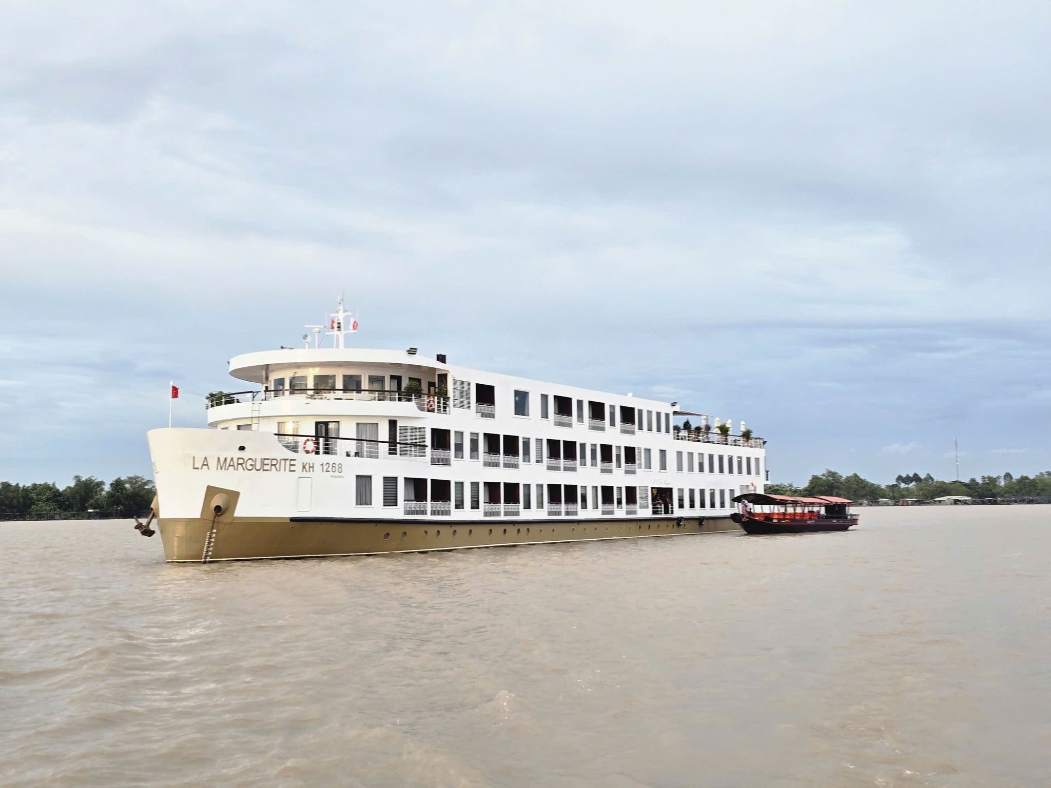 Tàu du lịch Mekong Travel đón đoàn tại bến cảng phường 9 đưa xuống tàu La Marguerite.