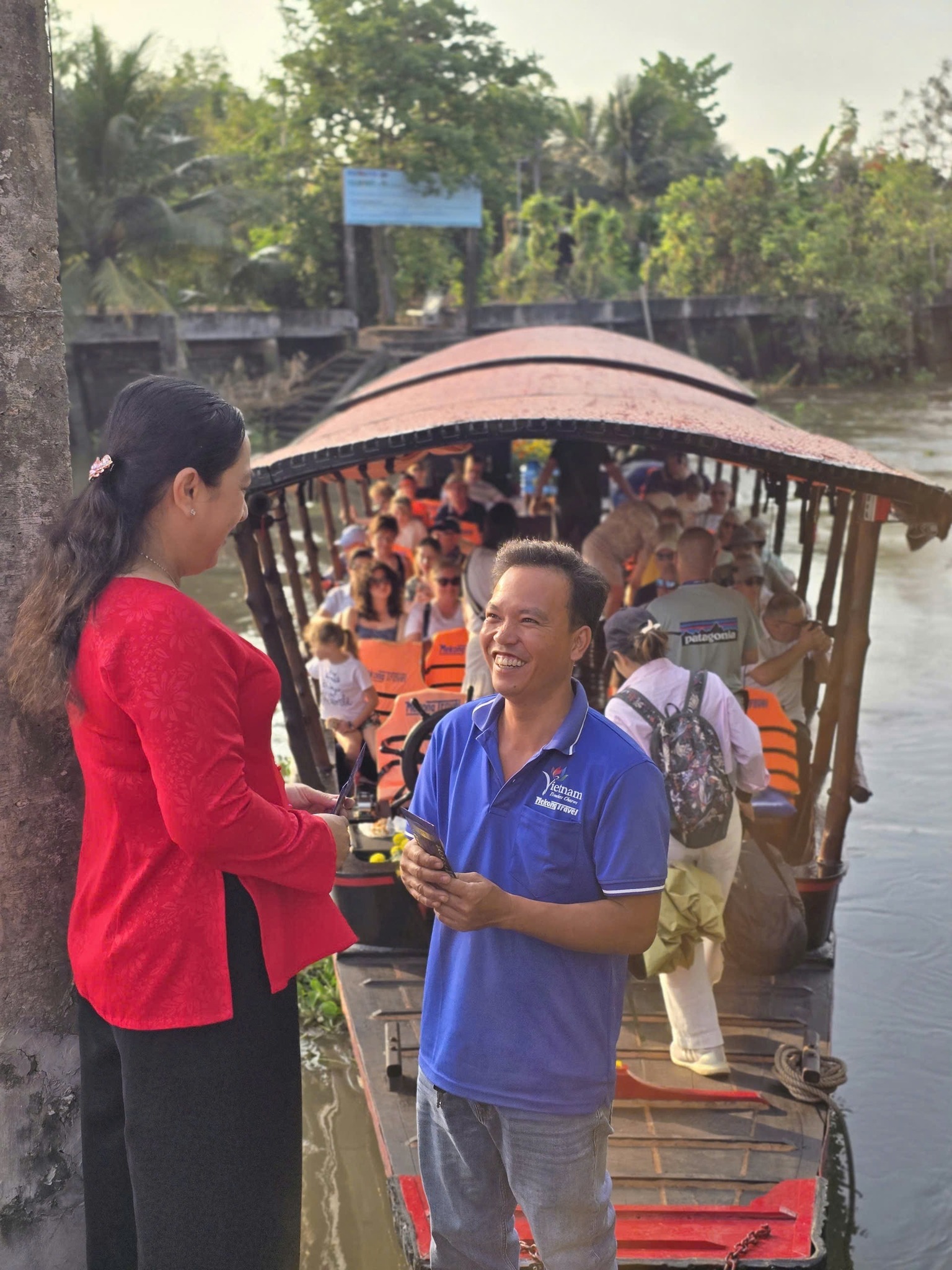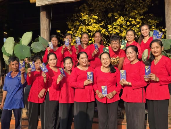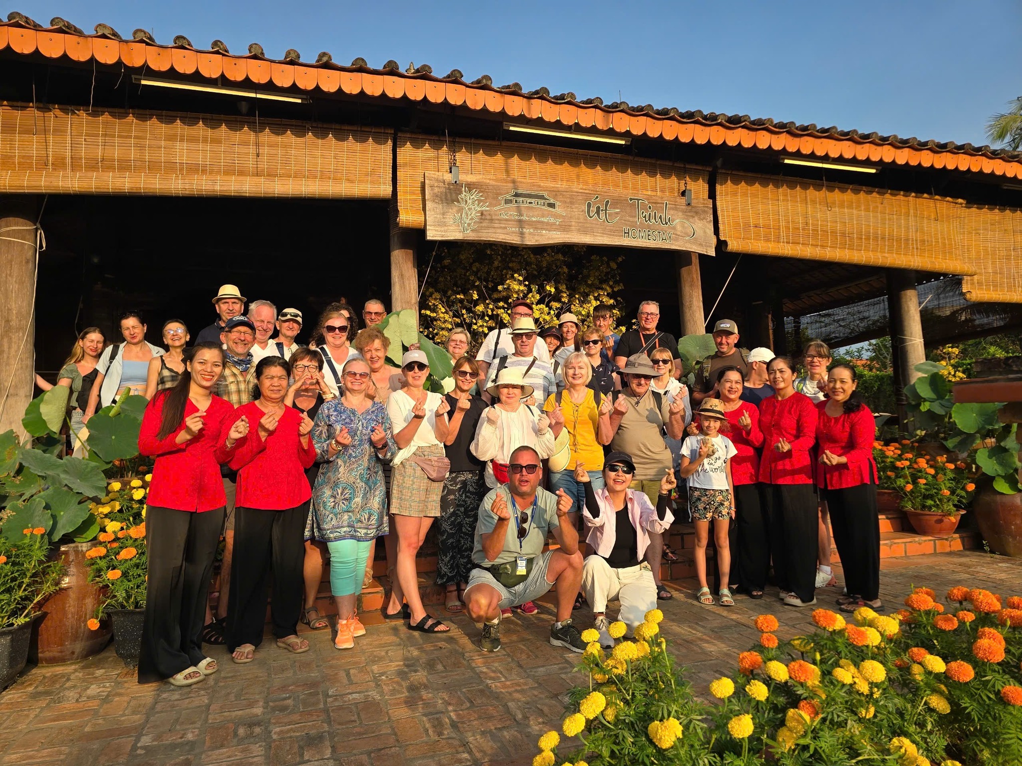Team Homestay Út Trinh đỏ rực ra tiễn nhóm khách ngủ Nhà Út Quỳnh đêm qua đã đón giao thừa với gia đình Út Trinh.